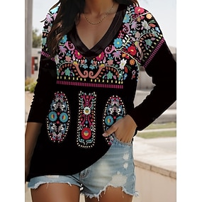 Dame Boho T-skjorte T skjorte T-skjorte Trykt mønster Blomstret Årgang Etnisk Fritid Langermet V-hals Vanlige topper Daglig Helg Ferieklær Blå Vår Høst