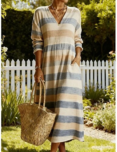 Dame Maxikjole Skjortekjole Uformell kjole Mote Grunnleggende Moderne Daglig utendørs Strand Løstsittende Stripet 3/4 ermer V-hals Lyseblå Sommer Vår