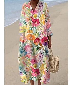 Dame Maxikjole Skiftkjole Fritid Ut på byen Løstsittende Blomstret Grafisk Langermet V-hals Rosa Kakifarget Sommer Vår
