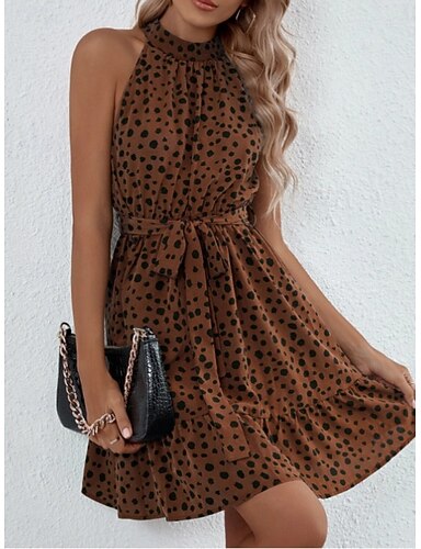 Dame Mini kjole Kjole med A-linje Slipkjole Off The Shoulder-kjole Ferie Fritid utendørs Ut på byen Standard passform Leopard Polkadotter Ermeløs Grimehals Svart Brun Grønn Sommer Vår