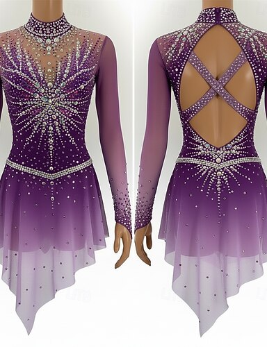 Kjole til kunstløp Dame Jente Skøyteløp Kjoler Lilla Lapper Åben Ryg Netting Spandex Høy Elastisitet Trening Konkurranse Skøyteklær Klassisk Krystall / Rhinstein Langermet Skøyting Kunstløp