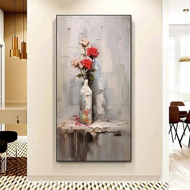 håndlaget oljemaleri på lerret veggkunst dekorasjon abstrakt wabi-sabi-stil grå eksklusiv vertikal blomsterstilleben for hjemmedekor strukket ramme hengende maleri/rullet rammeløs ustrukket maleri