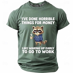 Herre-T-skjorte med «Jeg har gjort forferdelige ting for penger», morsom vaskebjørngrafikk, korte ermer, rund hals, sliten vaskebjørn, drikker kaffe, kontorhumor, sarkastisk jobbgave til kollega,