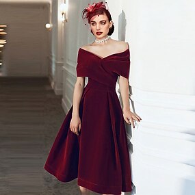 A-Line Cocktailkjoler Elegant Kjole Bryllupsgjest Kneelengde Korte Ermer Off Shoulder Velur med Plisseringer Renfarge Kjoler