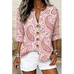 Dame Skjorte Trykt mønster Grafisk Paisly Elegant Årgang Tropisk Halvlange ermer V-hals Vanlige topper Daglig Ferie Strand Klær Rosa Oransje Grønn Sommer Vår
