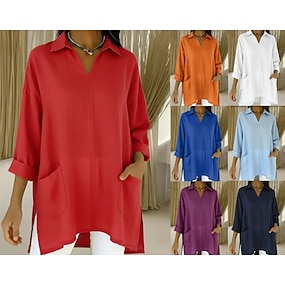 Dame Skjorter i bomullslin Sommertopper Bluse Dressy topper Rynket Lapper Lomme Helfarge عادي Elegant Årgang damer 3/4 ermer Skjortekrage Vanlige topper Daglig Arbeid Ut på byen Blå Gul Lilla Grønn