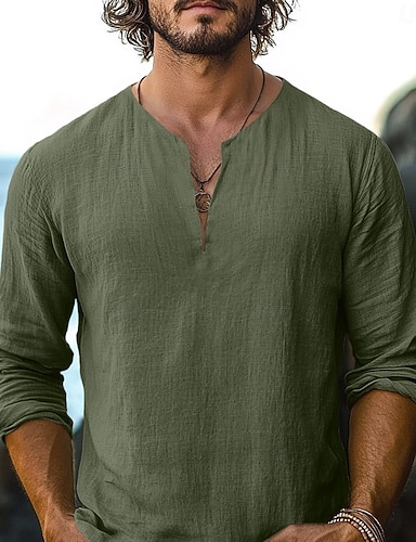 Herre Skjorte Linskjorte Popover skjorte Uformell skjorte Skjorte i bomullslin عادي Gateklær Feriereise Blå Svart Kakifarget Grå Langermet V-hals Vår & Vinter Klær Lomme