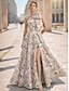 A-linje Gulvlengde Perlebrodert Gjestekjole til bryllup Formell kjole Kjole til brudens mor Langermet Skjortekrage Elegant Årgang Høy splittelse Formell Bryllupsgjest Sateng med Glimmer Spalte