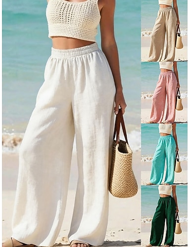 Dame Imitert bomullslin Bred Bukseben kinesisk Sommerbukser Ferie Grunnleggende Fritid Full lengde Høy Midje عادي Elastisk midje comfy Myk Bekvem Elastisk utendørs Gate Gul Navyblå Grønn Beige Sommer
