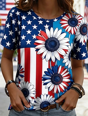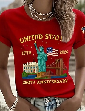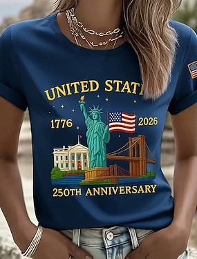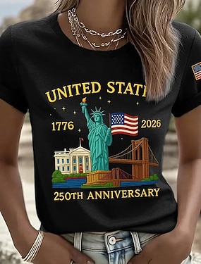 Uavhengighetsdag amerikansk jubileum patriotisk dameskjorte trykk grafikk flagg bokstav stilig klassisk uformell kortermet crew neck vanlig topper daglig blå svart hvit rød sommer vår
