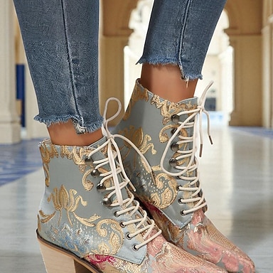 Dame Støvler Combat-boots Støvletter ankelstøvletter Daglig utendørs Blomstret Ankelstøvler Broderi Lav hæl Tykk hæl Rund Tå Elegant Årgang Fritid PU Tøfler Gul Rød Blå