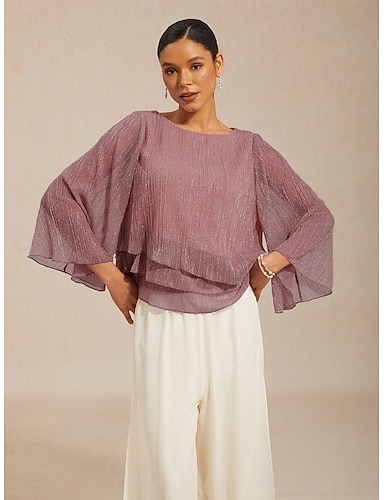 Dame Bluse Dressy topper Chiffongoverdeler Flettet Glimmer Helfarge Elegant 3/4 ermer Crew-hals Bryllupsgjest Ferie Sølv Sommer Vår Høst