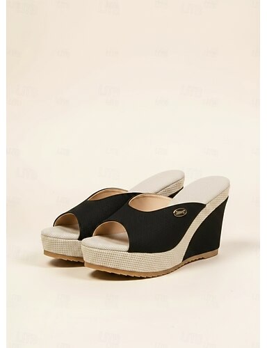 Svarte damesandaler med kilehæl og peep toe – uformelle sommerlige espadriller med platåsko for ferie og strandantrekk