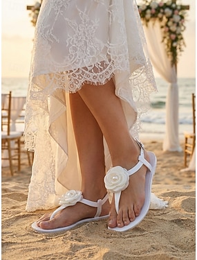 hvite, blomstrete, flate sandaler til dame, elegante brudesko med blonder, strandsandaler til bruder