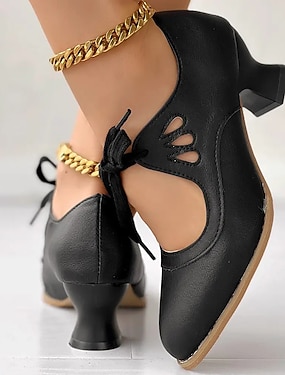 Svarte Mary Jane-hæler i damestil fra 1950-tallet med sløyfe – retro pumps med grov hæl og utskjæring for daglig vintage-bruk og swingdans
