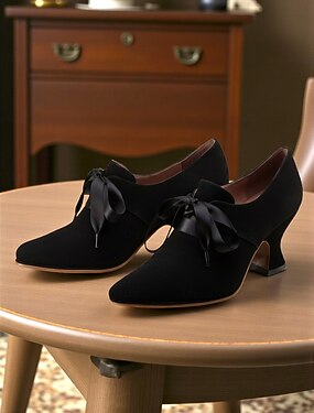 Damesko i edwardiansk stil fra 1920-tallet med røde rutete hæler og svart satengsløyfe – elegante retro julesko til festlige anledninger og anledninger