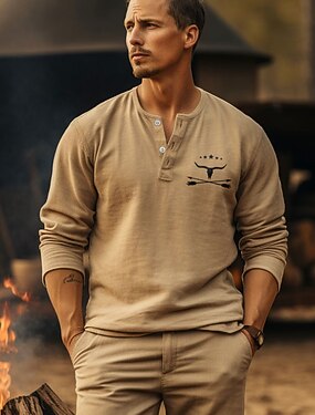 Herre Grafisk Camping Cowboy Henly-skjorte Langermet 3D-utskrift Daglig Fritid Vintage retro Avslappet Sport & Utendørs Ut på byen Vår & Vinter Svart Navyblå Brun Militærgrønn Grå Henley Henley