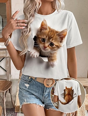 dame t-skjorte mote kattetrykk kortermet vanlige topper rund hals daglig helg hvit sommer 3d katt