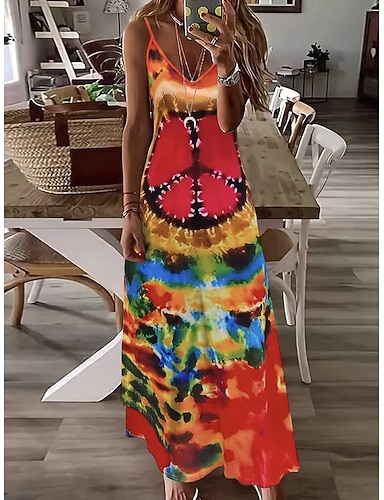 Dame Maxikjole Solkjole Kjole med A-linje Slipkjole Ferie Fritid Strand Ut på byen Løstsittende Nyanse Grafisk Batikkfarget Ermeløs V-hals Rød Lys Lilla Sommer Vår