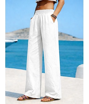 Dame Linbukser i bomull Bukser Sommerbukser Ferie Grunnleggende Fritid Full lengde Medium Midje Snorer Elastisk midje Komfort Lettvekt Pustende Uelastisk Strand Reise Ferie Blå Grå Svart Hvit Sommer
