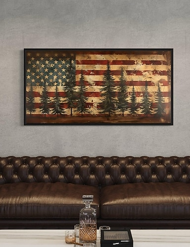 Rustikk Amerikansk Flag Ekstra Stor Veggkunst Patriotisk Veggkunst Flag og Furu Trær Maleri Canvas Print Innrammet Klar til Å Henge