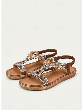 Dames bohemske brune stroppesandaler med imiterte steinperler – komfortable, flate strandsko med ankelstropp for sommerferier og øyturer &uformelt antrekk ved sjøen
