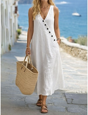 Dame Midikjole Imitert bomullslin Skiftkjole Solkjole Strandkjole Elegant Mote Moderne utendørs Strand Feriereise Normal عادي Ermeløs V-hals Svart Hvit Brun Grønn Sommer Vår