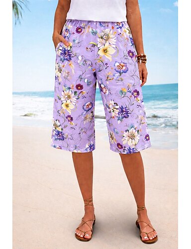 Dame Bermudashorts kinesisk Shorts Ferie Årgang Etnisk stil Knelengde Høy Midje Blomstret Grafisk Elastisk midje Komfort Uelastisk Daglig Feriereise Formell Blå Rosa Lilla Sommer Vår Normal