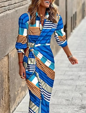 Dame Maxikjole Skjortekjole Uformell kjole Print kjole Elegant Mote Moderne utendørs Feriereise Helg Normal Grafisk Stripet Langermet Skjortekrage Rød Oransje Grønn Sommer Vår Høst