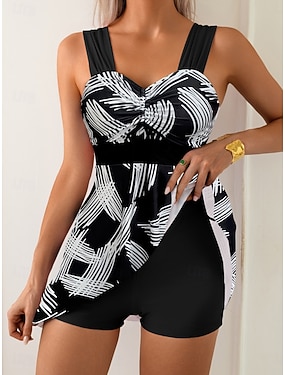 Dame Badetøy Tankini 2 stk Shorts Badedrakt Midjekontroll Høy Midje Tynn Åpen rygg Elegant Ferie Stripet Øsehals Ermeløs Badedrakter