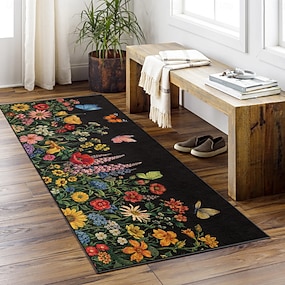 Løperteppe mørk bakgrunn med fargerike blomster og sommerfugler lang dekorativ gangmatte