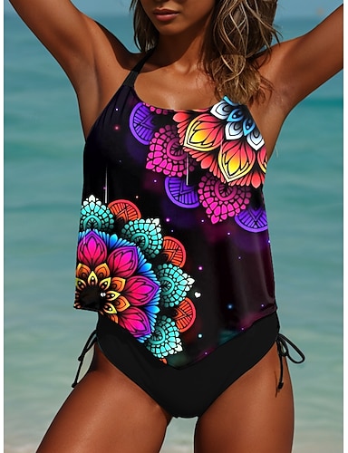 Dame Badetøy Tankini 2 stk Badedrakt Badedrakt 2 deler Beskjedne badetøy Ferie Strand Klær Blomstret Trykt mønster Med stropper Ermeløs Badedrakter