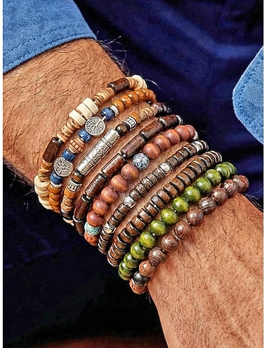 Armbåndsett i bohemsk stil for menn, 6 deler med justerbar lengde, legering, kokosnøttskall &treblandet materiale, perfekt for strandferie, uformell hverdagsbruk