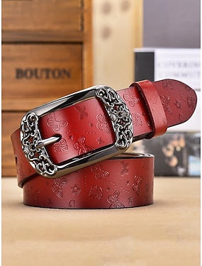 rødt skinnbelte for kvinner med vintage blomsterutskåret spenne – tilbehør i vestlig boho-stil