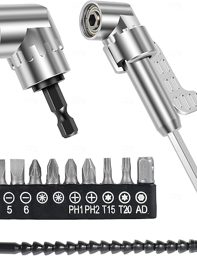 4-pakning 105-graders rettvinklet boradaptersett, slagtrekker og magnetisk skrutrekker, pipebor, hjørneverktøy, skruenav (kort + lang) og fleksibel vinkelforlengelsesbit for trange rom