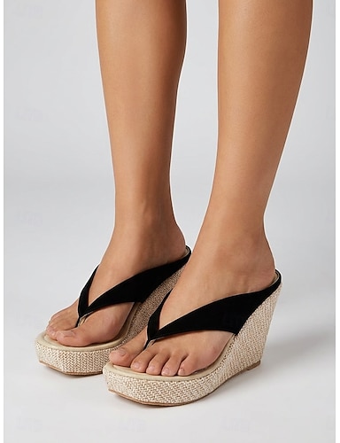 Svarte damesandaler med kilehæl – elegante, høye platåsandaler i semsket skinn med vevd espadrillsåle for øyferier og tropiske strandferier &sommerklær for cruise