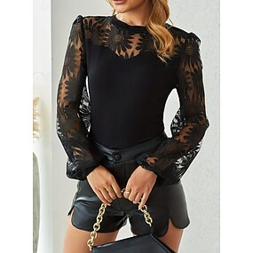 Dame Blondeskjøtetopp T-skjorter med øyeombroderi Slim fit topp Broderi Blomstret Elegant Mote Fritid Langermet Lanterne Erme Crew-hals Rund hals Vanlige topper Daglig Ut på byen Svart Vår Høst