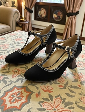 kvinners svarte røde semskede Mary Jane hæler med sløyfedetalj og blokkhæl - vintage stil for fester og festlige anledninger