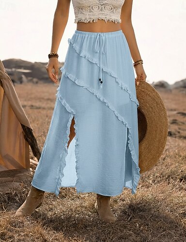 Dame Ferieskjørt Bohem Årgang Mote Etnisk Maksi Høy Midje Skjørt عادي Rynket Lapper Varm boring Uelastisk Strand Feriereise Blå Eple Grønn Rødbrun Lysegul Sommer 100% Polyester Lin