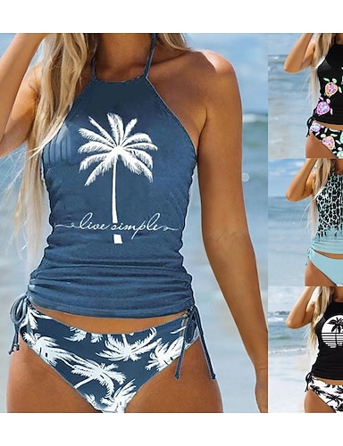 Dame Rynket tankini 2 deler Tropisk UV Beskyttelse Elastisk Ermeløs Badetøy Surfing Strand Svømming Sommer