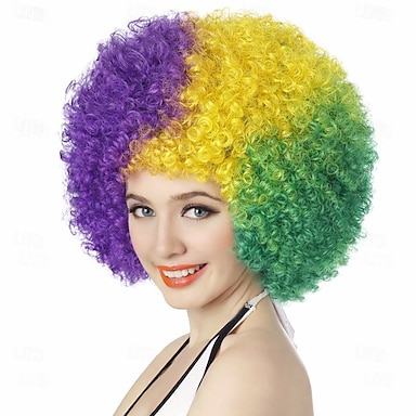 Karneval parykk lilla grønn gul afro afro krøllete kort syntetisk festival parykk Mardi Gras parade cosplay kostyme hår kvinner