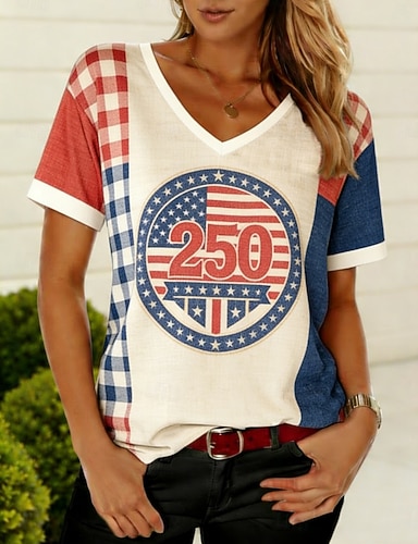 Amerikansk uavhengighetsdag Dame T skjorte T-skjorte Trykt mønster Blomstret Grafisk Amerikansk flagg Stilfull Klassisk Fritid Kortermet V-hals Vanlige topper Daglig Ut på byen Blå Svart Sommer Vår