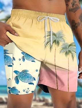 Herre Kokosnøttre Skilpadder Tropiske planter Fôret shorts 2 i 1 svømmeshorts Badeshorts Medium Midje Hawaiisk Feriereise Sidelommer Med kompresjonsforing Elastisk snøring i midjen Designer Klær
