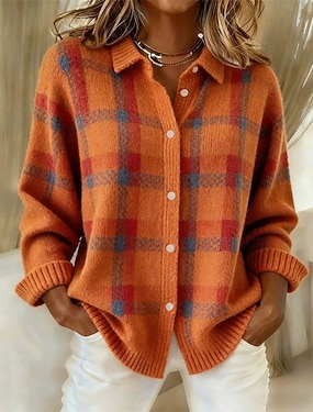 Dame Genser Kofte Elegant Mote Gatemote Helfarge Ruter Skjortekrage Lapper Knapper Strikket Langermet Vanlige topper Strikke Daglig Hjem utendørs Blå Lysegrønn Høst Vinter