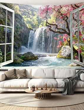 foss vindu utsikt hengende veggteppe veggkunst stort billedvev veggmaleri dekor fotografi bakteppe teppe gardin hjem soverom stue dekorasjon hyttekjerne