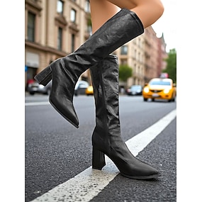 brune knehøye støvletter til dame - lange støvletter med spiss tå og blokkhæl i imitert skinn for gatestil, uformelle høst-vinterantrekk og hverdagsbruk