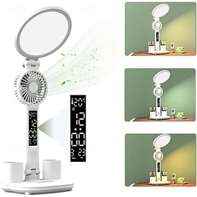 LED-skrivebordslampe med vifte, skrivebordslampe for studenthjem, 3 fargetemperaturer, USB-ladeport, justerbar, sammenleggbar skrivebordslampe med klokke, dato, penneveske, temperaturlampe for
