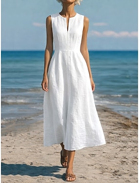 Kvinners lin-liknende falske bomull-lin maksi-kjole A-linje-kjole sommerkjole casual daglig normal passform ensfarget uten ermer V-hals hvit sommer