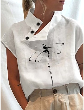 Dame T skjorte Skjorte i imitert lin Trykt mønster Dragonfly Elegant Stilfull Klassisk Kortermet Crew-hals Vanlige topper Daglig Ut på byen Helg Blå Hvit Marineblå Sommer Vår