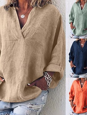 Dame Skjorter i bomullslin Imitert bomullslin Helfarge Daglig Stilfull Grunnleggende Langermet V-hals Vanlige topper Daglig Blå Hvit Gul Rød Oransje Sommer Vår Høst